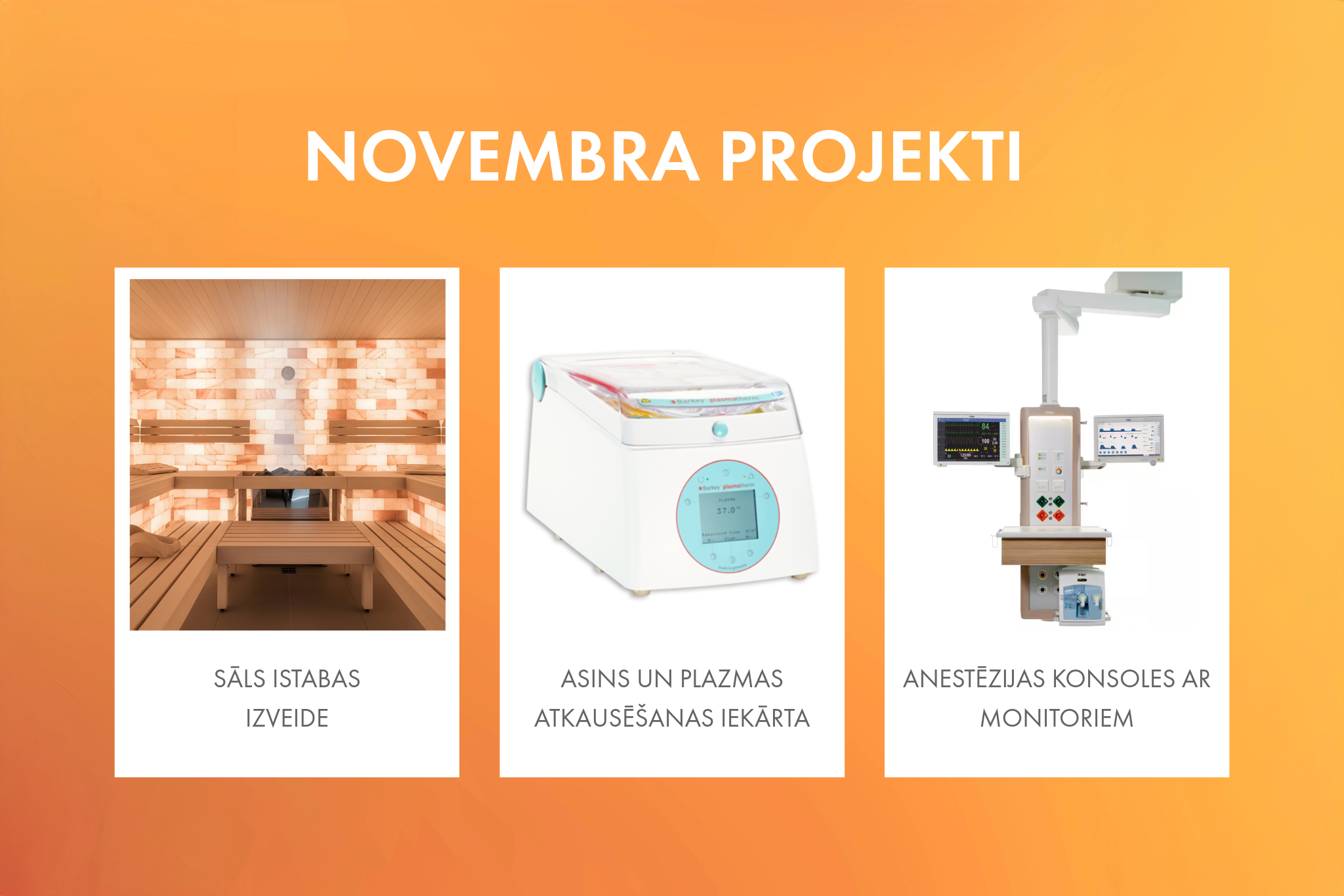 Novembrī SIA A.Medical veiksmīgi pabeidza vairākus nozīmīgus projektus medicīnas un veselības aprūpes jomā, tai skaitā sāls istabu izveidi, jaunu asins un plazmas atkausēšanas iekārtu nodrošināšanu un anestēzijas konsolu piegādi ar griestu monitoriem. Lasīt vairāk